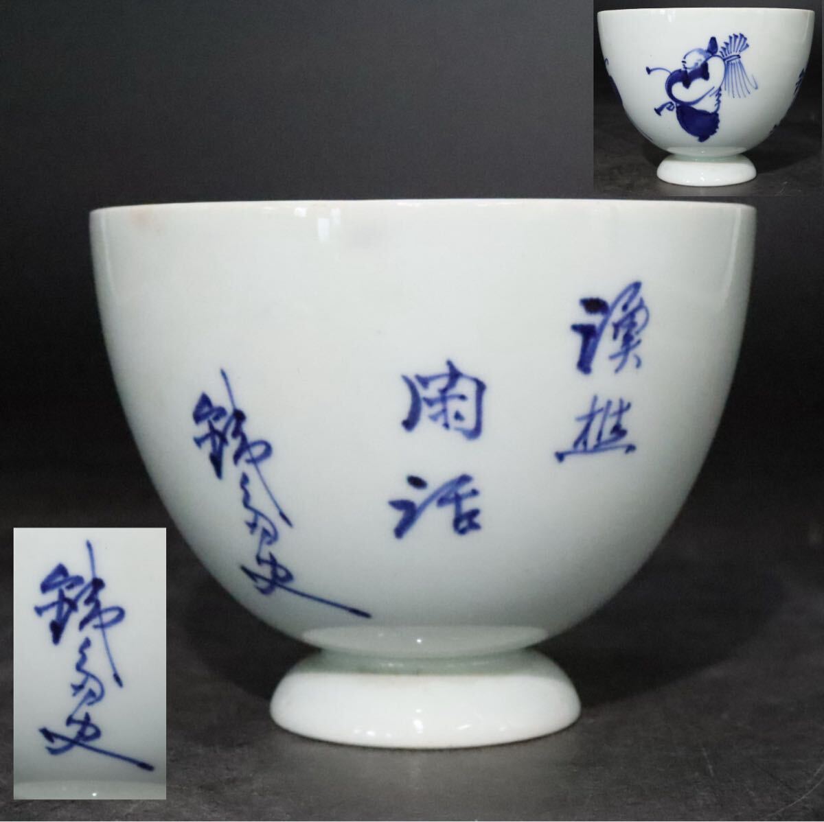 - 鐵斎 書 画 染付 足付 丼 茶碗 / 京焼 鉄斎 富岡鉄斎 煎茶道具 茶道具 鉢 .B1360
