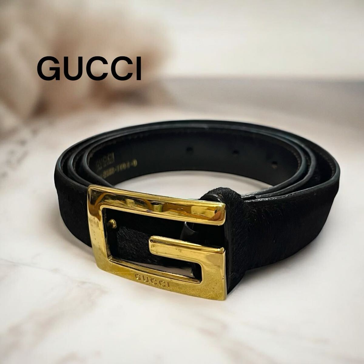> GUCCI グッチ Gロゴ バックル ベルト ハラコ レザー ブラック 80/32 2888 イタリア製 ヴィンテージ ゴールド 黒 良品 レディース レトロ