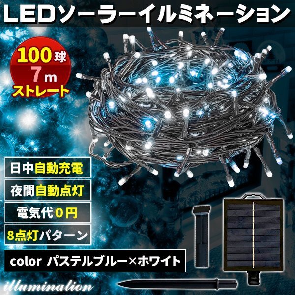 - ソーラー イルミネーション 屋外 クリスマス ストレート 屋外用 イルミネーションライト 100球 パステルブルー×ホワイト