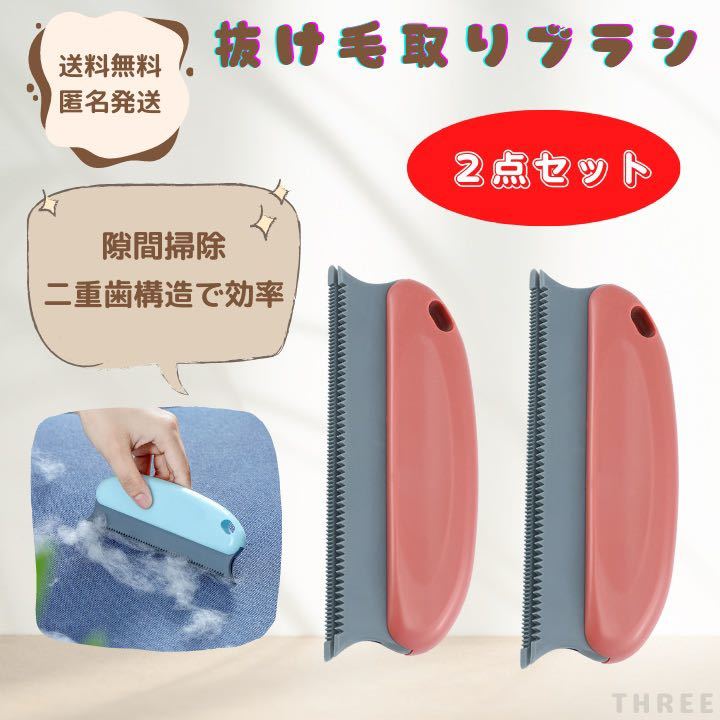- 【2点セット】抜け毛取りブラシ 隙間掃除 ペット 犬猫 コンパクト 繰り返し使用 レッド