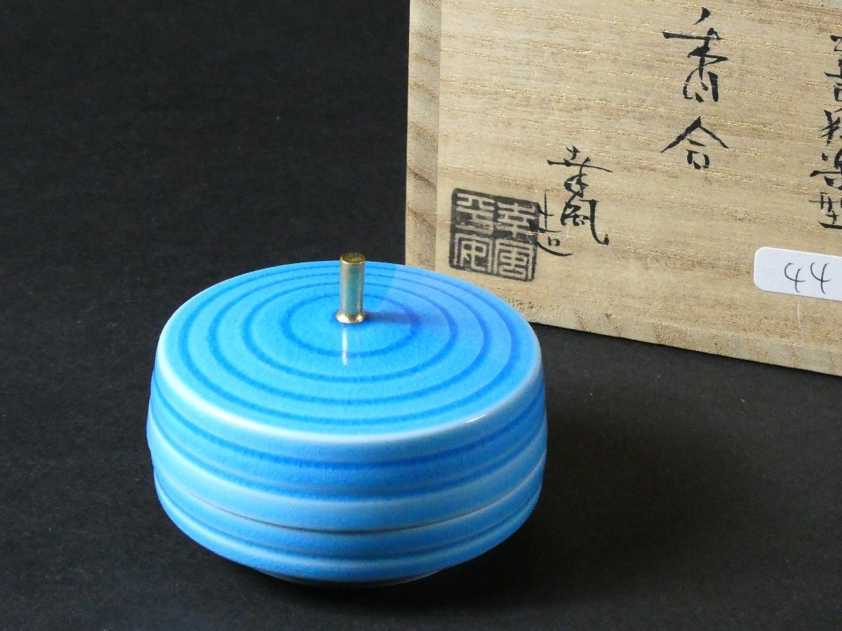 ・京焼 曽根幸風 浅黄独楽型 香合 共箱 /香道具 茶道具 青 交趾 内金