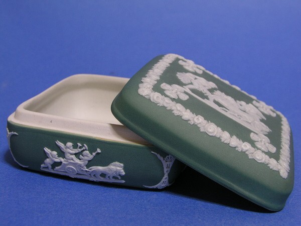 - ◎1920年代 ウェッジウッド 緑色を被せた白のジャスパー 綺麗な角形蓋物◎