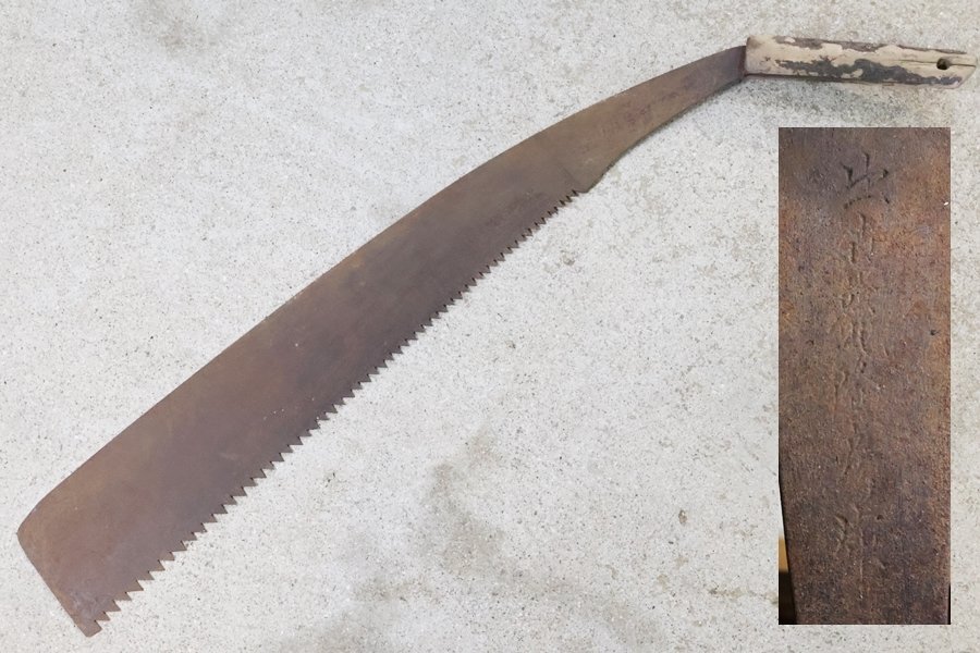 - TB526手曲鋸 木挽き鋸 刃渡り約54cm◇在銘/前挽大鋸/木挽鋸/山師/大工道具/のこぎり/刃物/本鋼/鉄刃/時代物/古道具タグボート
