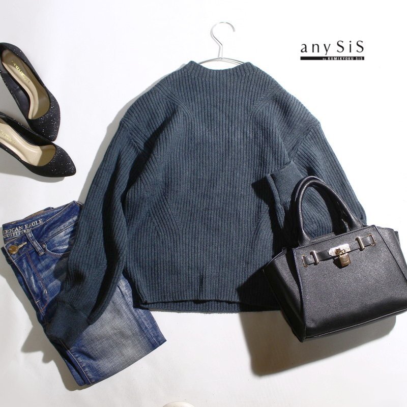 > 美品 エニィスィス any SiS 組曲 株)オンワード樫山 大きいサイズ4 冬 ゆったり ハイネック リブ ニットセーター XL くすみ ネイビー 紺