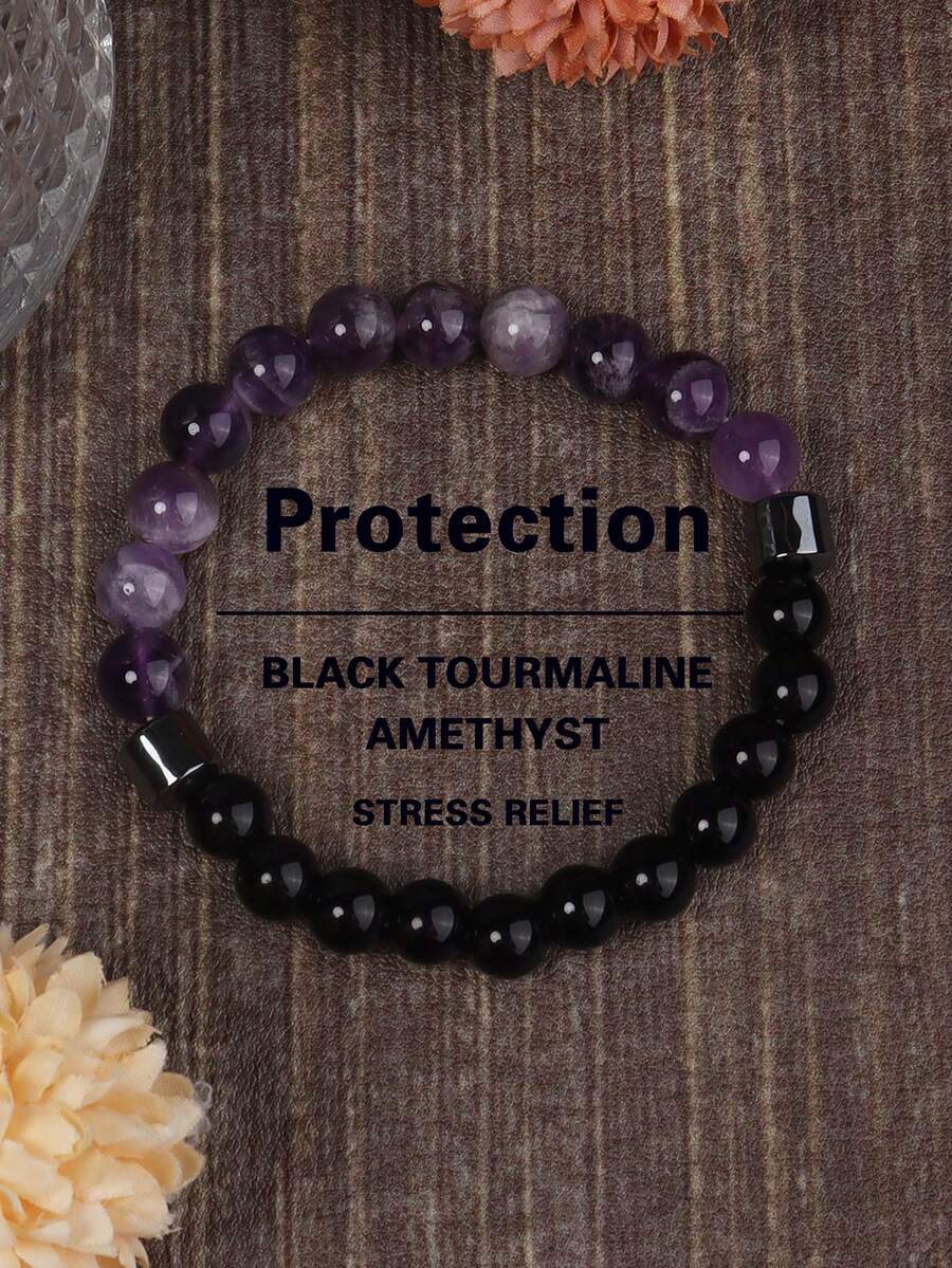 - ジュエリー メンズ ブレスレット 8mmアメジスト&ブラックトルマリン天然石ビーズブレスレット、ヒーリング&プロテクション、不安、