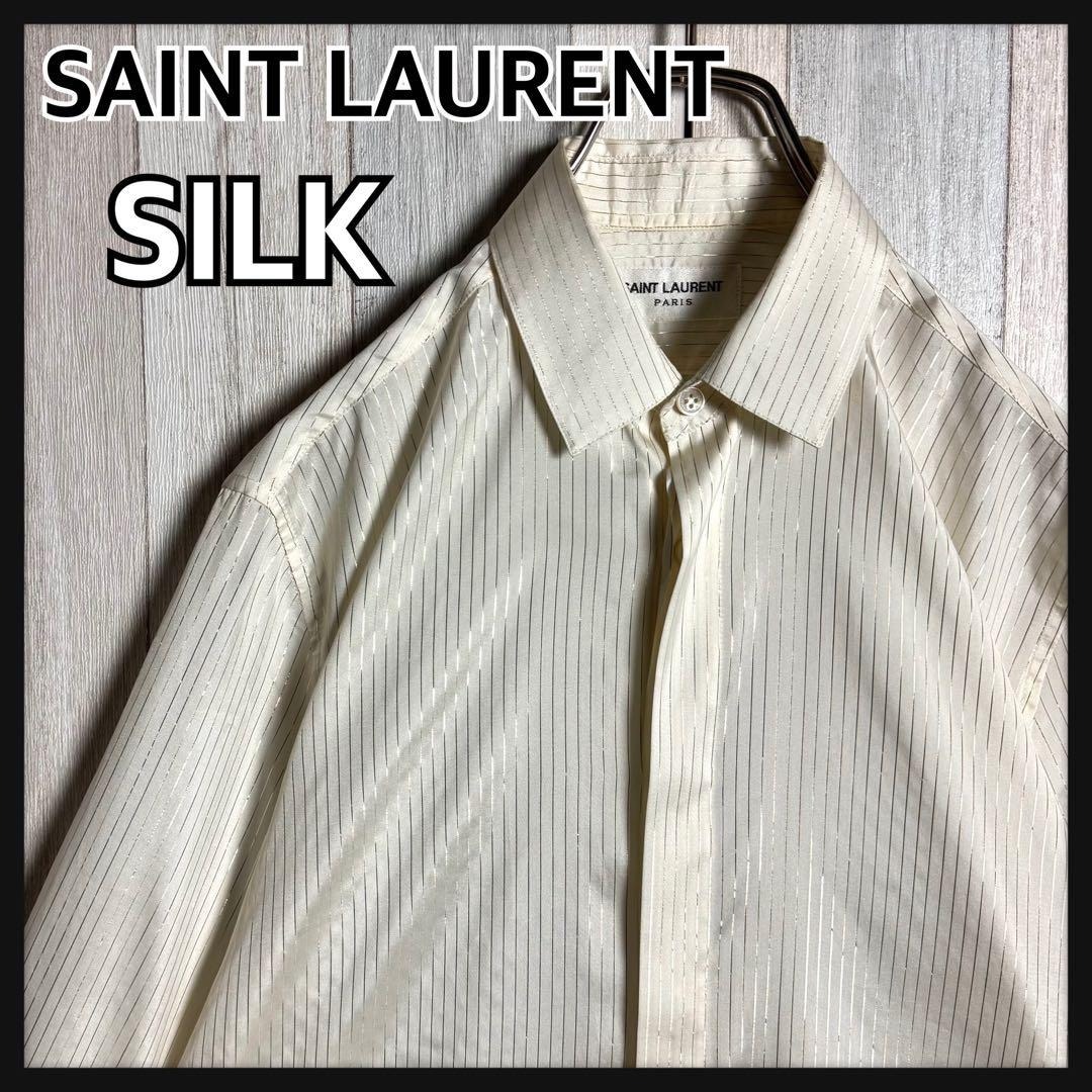 - 【未使用級・極美品・シルク】イタリア製 SAINT LAURENT PARIS サンローラン ゴールドストライプ L/S・長袖 シャツ アイボリー 36 M相当
