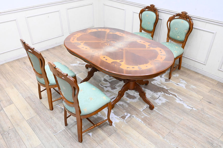 > EI261 伝統 イタリア製 Mollero社 光沢仕上 本象嵌 ダイニングセット 5点 4人用 食卓テーブル 食卓机 椅子 彫刻 お洒落なファブリック