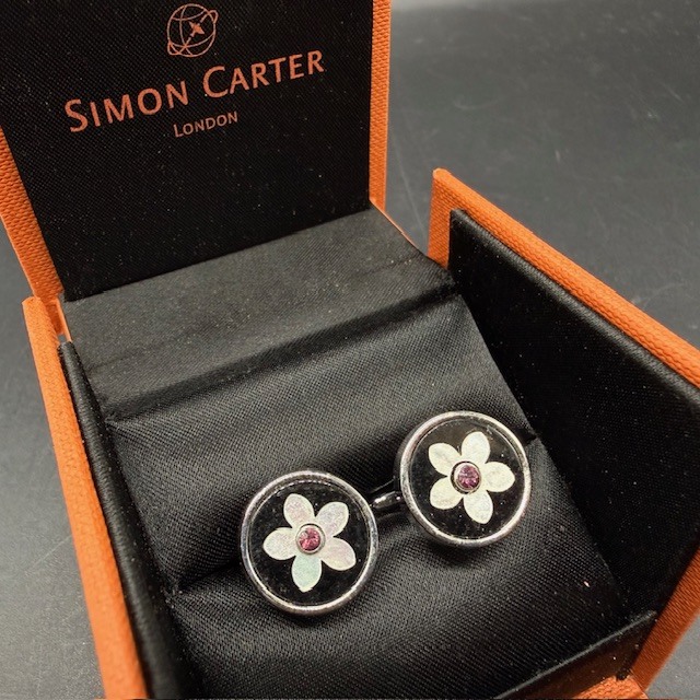 - 1円~ SIMON CARTER サイモンカーター カフス フラワー 花 ブラック ホワイト シェル アクセサリー スーツ メンズ 紳士 レディース 11138