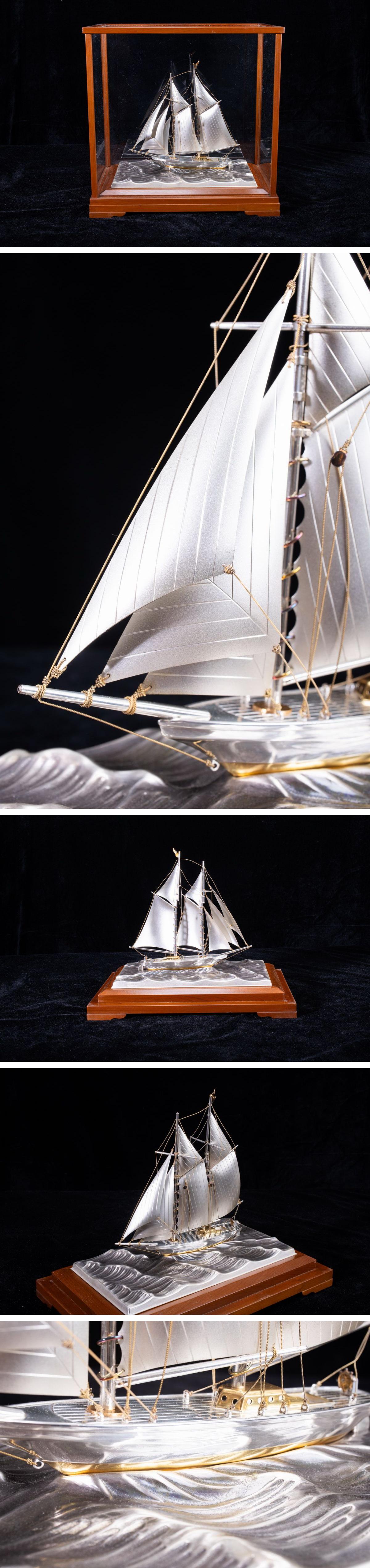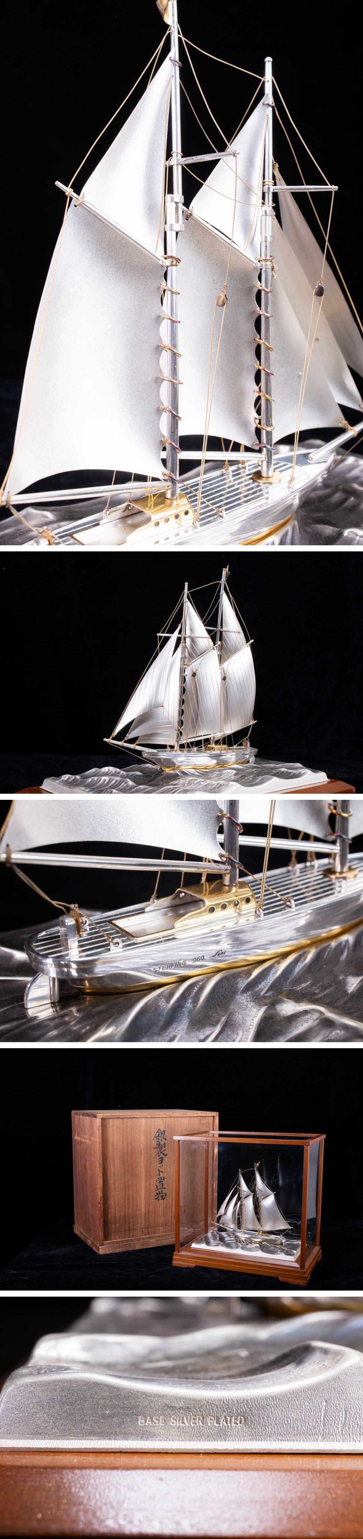 > 【珍品堂】1円から N37-V18 銀製 ヨット シルバー 在銘 帆船 時代物 高31.5㎝ ケース付 共箱 木箱 縁起物 鑑賞品 骨董品 古美術 希少