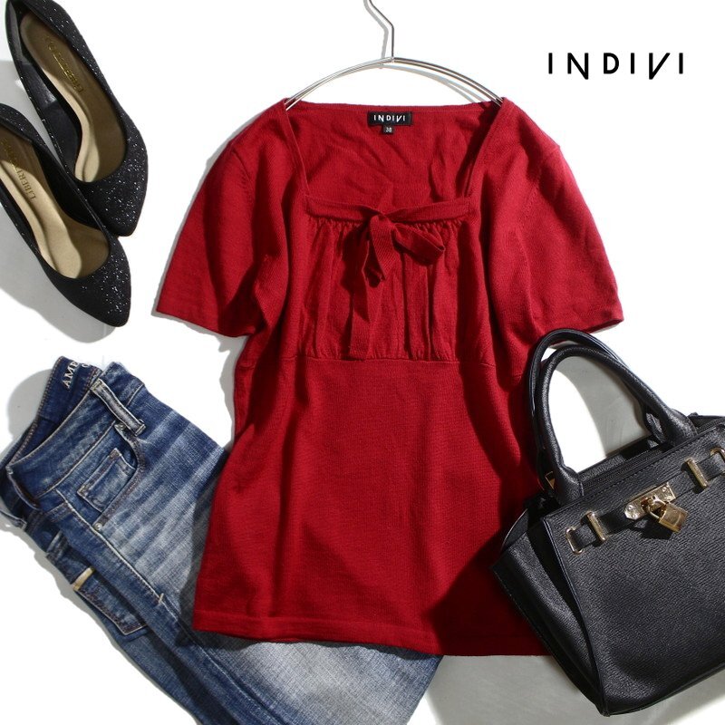 - 美品 INDIVI インディヴィ 株)ワールド 秋 冬 スクエアネック 半袖 ニットカットソー リボン 38 M ボルドー レッド 赤 ウール100% オフィス