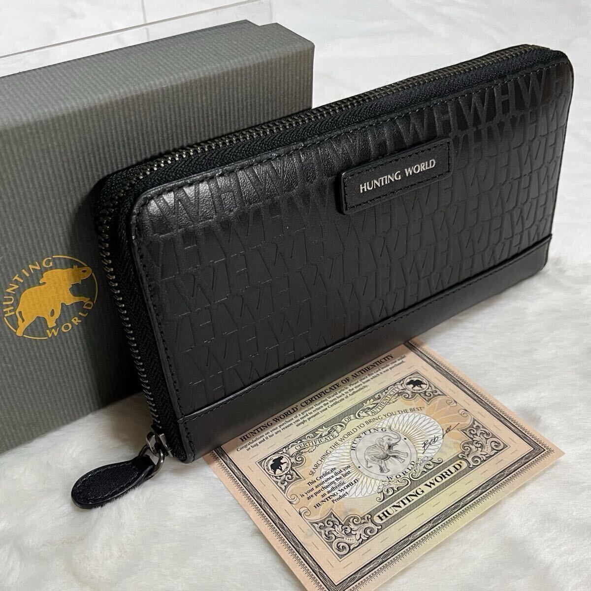 - 未使用級 ギャランティー 箱付 ハンティングワールド 長財布 ラウンドファスナー ブラック レザー HUNTING WORLD HWロゴ