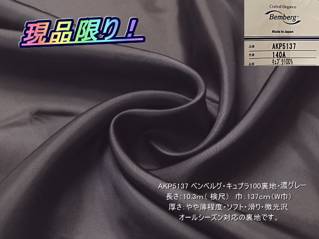 - AKP5137 ベンベルグ キュプラ100裏地 濃グレー 10.3mW巾