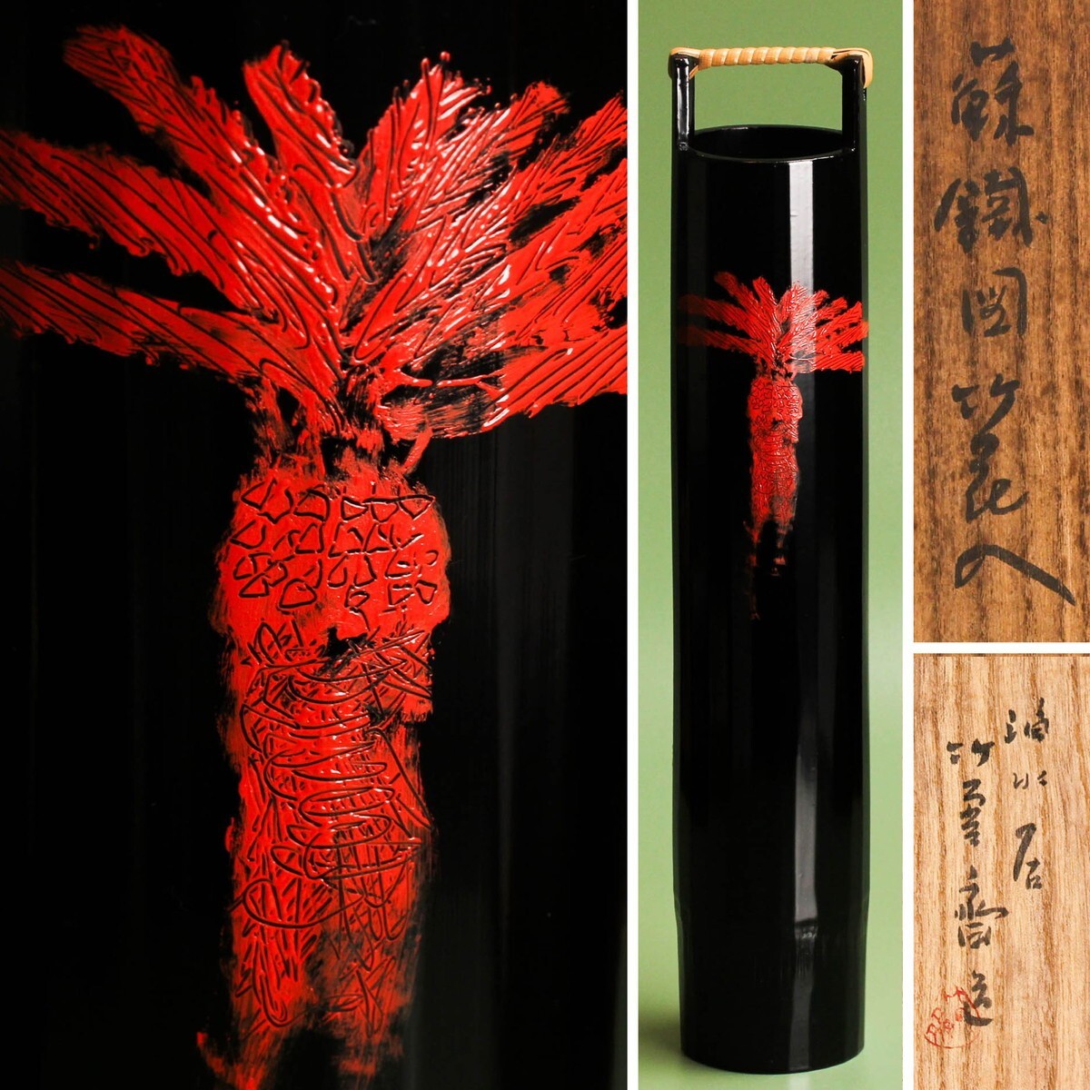 - 二代 田辺竹雲斎 蘇鐵図竹花入 高さ30cm 共箱 共布袋 本物保証