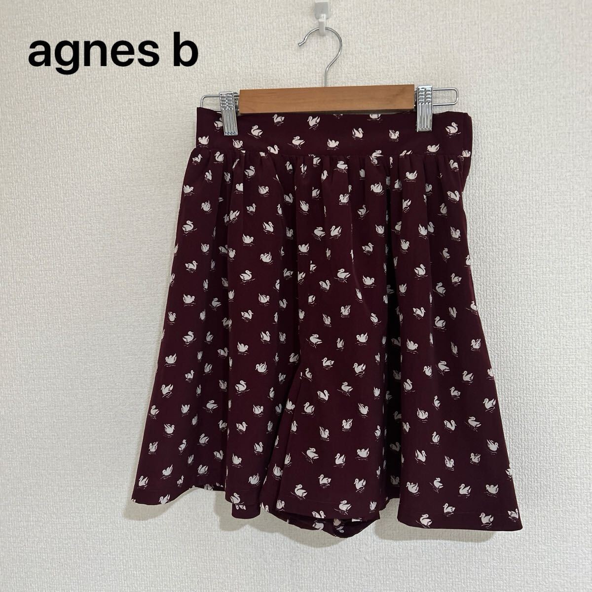 > agnes b アニエスベー パンツ キュロット ショートパンツ ハーフパンツ 膝丈 ギャザー 総柄 鳥 カジュアル 薄手 エンジ 38サイズ Mサイズ