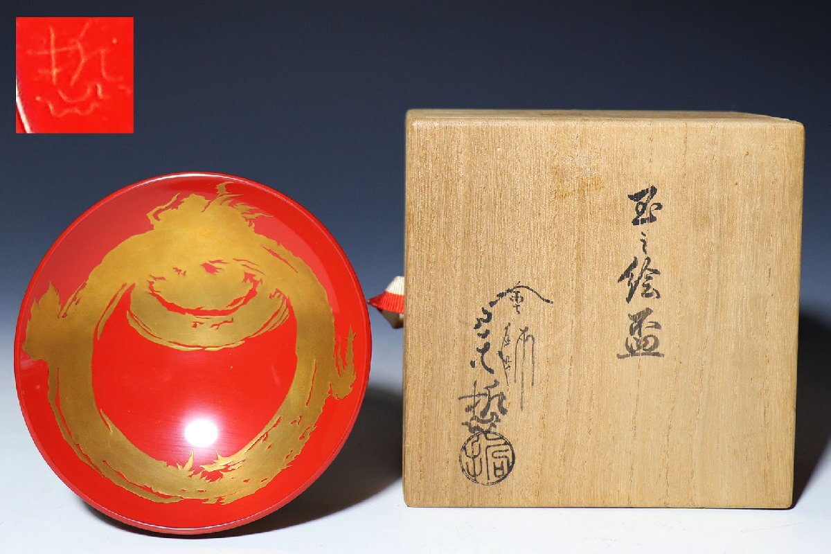 - 【桃】酒器ぐい呑み:蒔絵宝珠図平盃 宗哲 在銘共箱