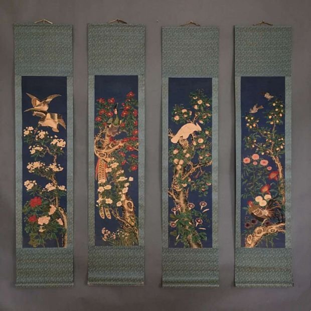 - 店長勧め 極美品 ! 中国美術 掛軸 4枚セット 花鳥絵柄 鑑賞 巻物 中堂画 装飾 立軸 zh660