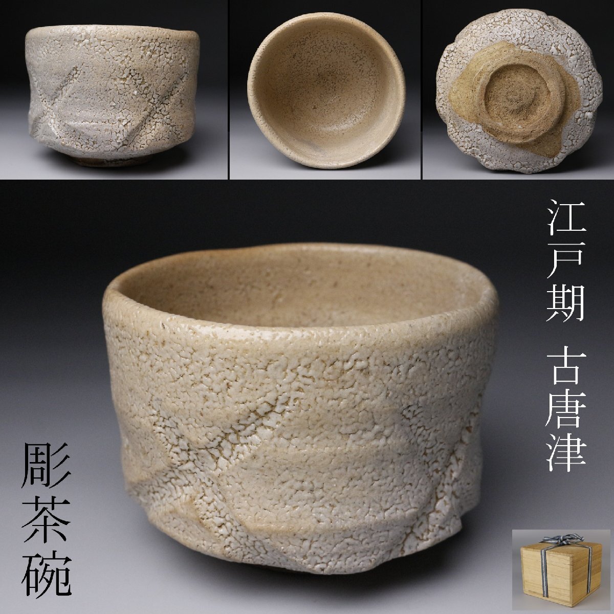 > 【LIG】江戸期 古唐津 彫茶碗 箱付き 発掘伝世 茶道具 古美術品 コレクター収蔵品 2511121