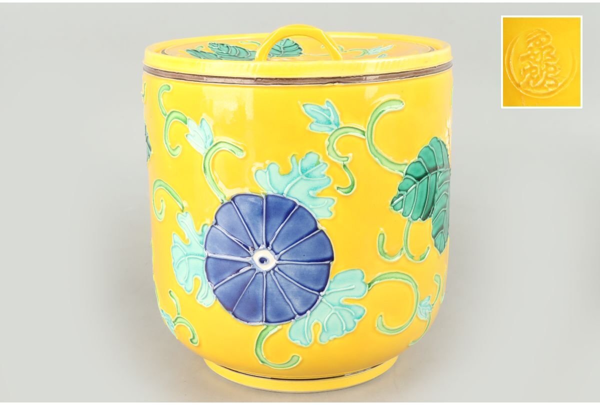 > [URA]中村翠嵐/黄交趾菊桐文水指/12-11-90 (検索)骨董/京焼/清水焼/水指/水差/建水/花入/蓋置/茶道具/水器