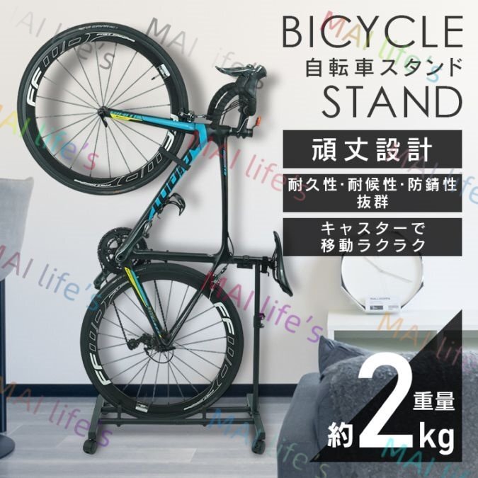 > 自転車スタンド 自転車立て 縦置き 高さ調節可能 キャスター付き 耐荷重約50kg 省スペース 室内保管 駐輪場