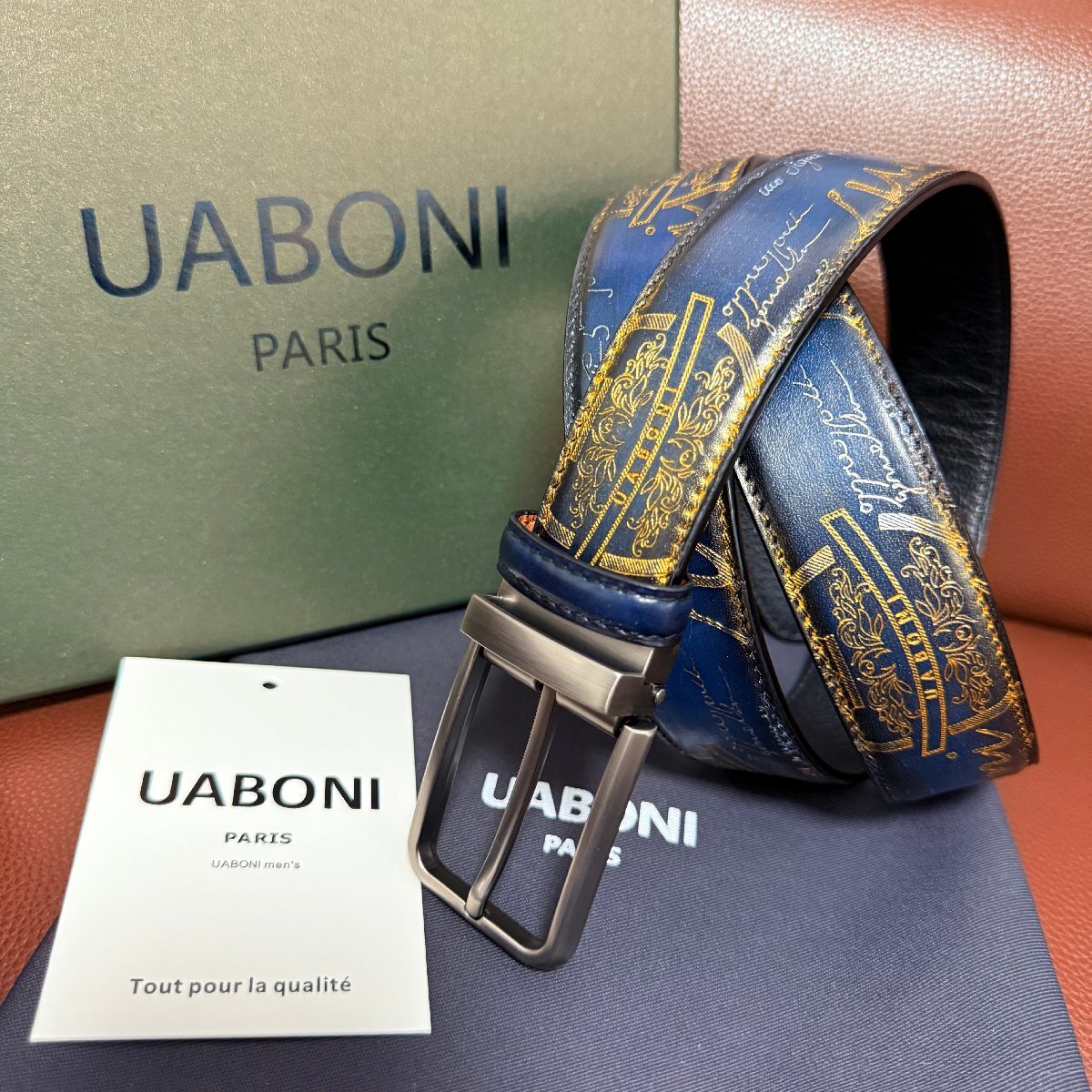 - 貴重品 EU製 定価9万◆UABONI*ユアボニ*幻のパティーヌ*ベルト◆本革 レザー カーフスキン 手染 ゴールデン 調節可能 ビジネス 紳士