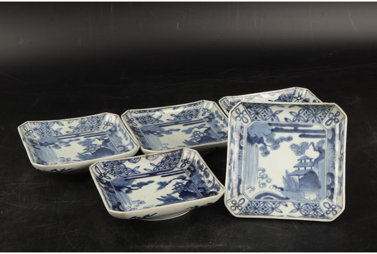 > [URA]成化年製/染付山水文角皿5客/7-11-85 (検索)骨董/角皿/中皿/膾皿/銘々皿/向付/小鉢/懐石道具/懐石料理