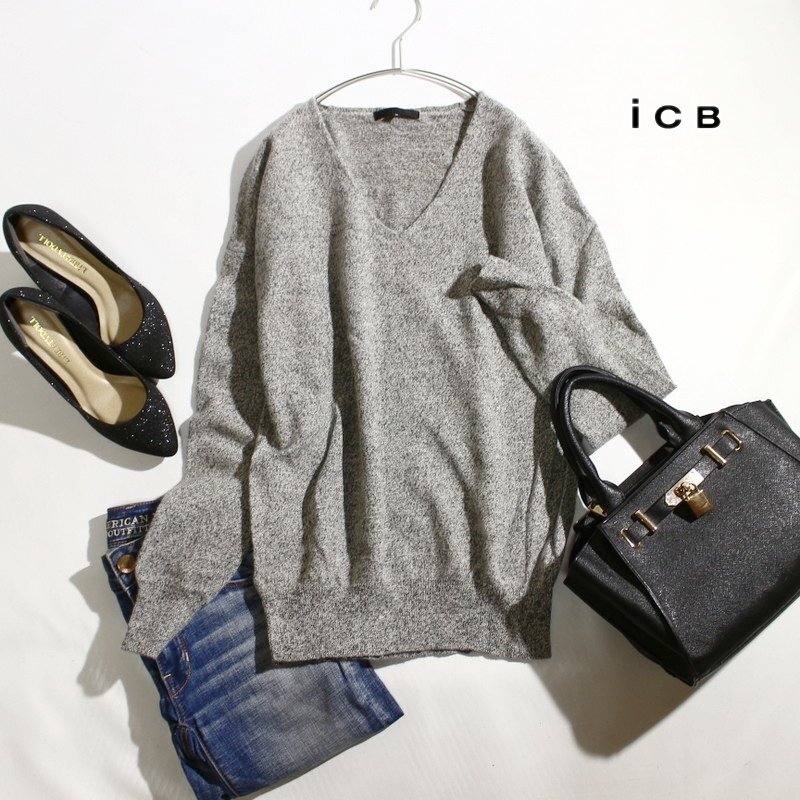 - 美品 ICB アイシービー 株) オンワード樫山 あったか カシミヤ 羊毛 Vネック 英字刺繍 ミックスニットセーター S ブラック カシミア