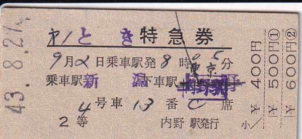 - 鉄道切符 硬券 第1とき 特急券(2等) 新潟→東京