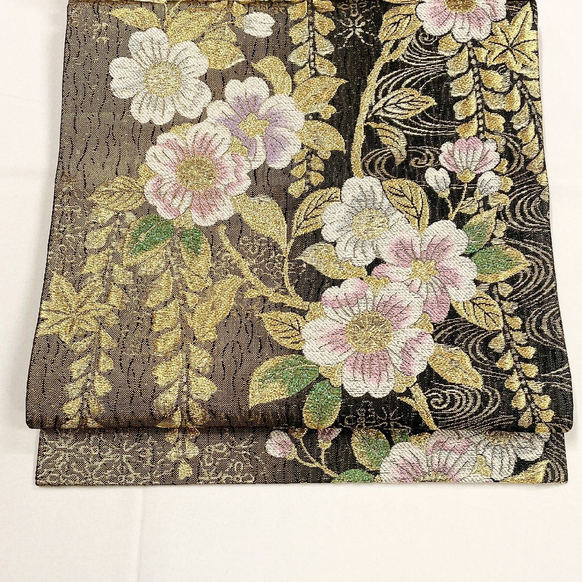 - 着物月花 煌びやかな花 袋帯 六通柄 正絹 金糸 ob7811