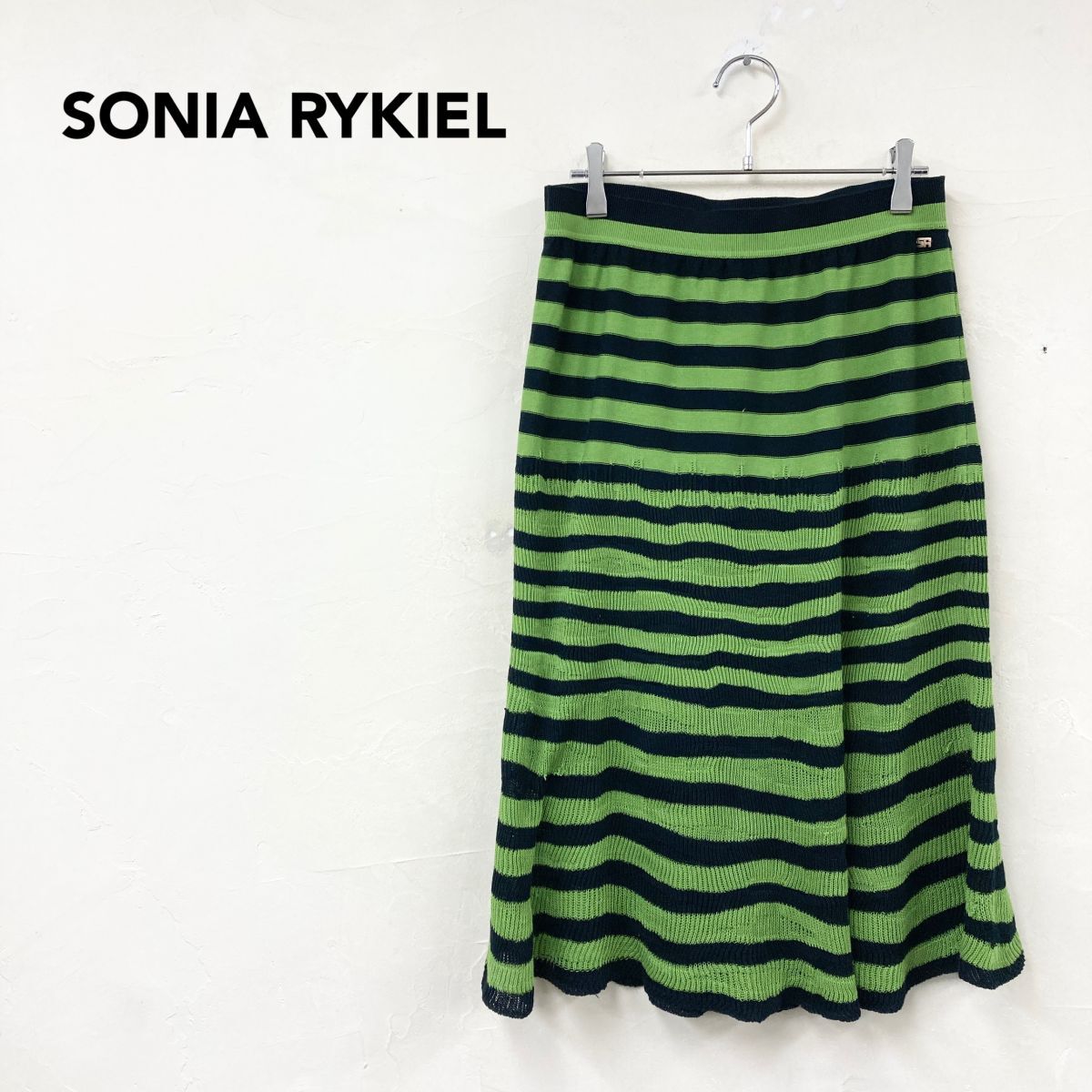 > 2M1942-K◆イタリア製 SONIA RYKIEL ソニアリキエル ニットフレアスカート◆size42 グリーン×ブラック ボーダー 薄手 綿100% カジュアル