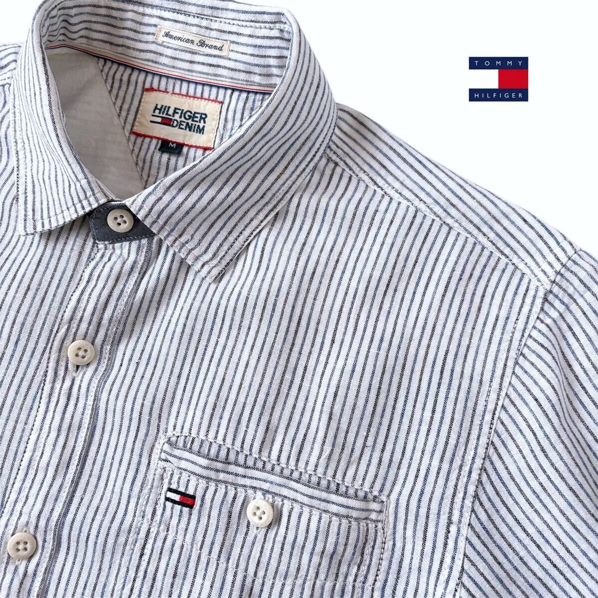 - TOMMY HILFIGER DENIM トミーヒルフィガー デニム リネン コットン ストライプ 長袖シャツ M ネイビー ブラック ホワイト 麻 綿 シャツ