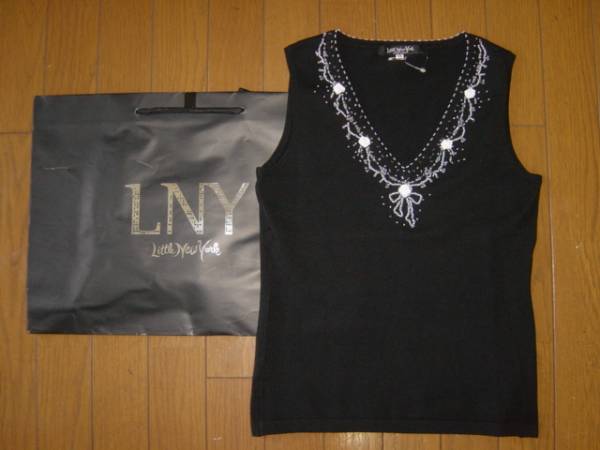 > ◆新品Little NewYorkリトルニューヨーク◆白バラ薔薇& ビジュー黒ノースリーブカットソー◆サマーニット ブラック