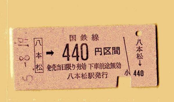 - ☆硬券/乗車券/国鉄/八本松→440円 55.8.19 2254☆