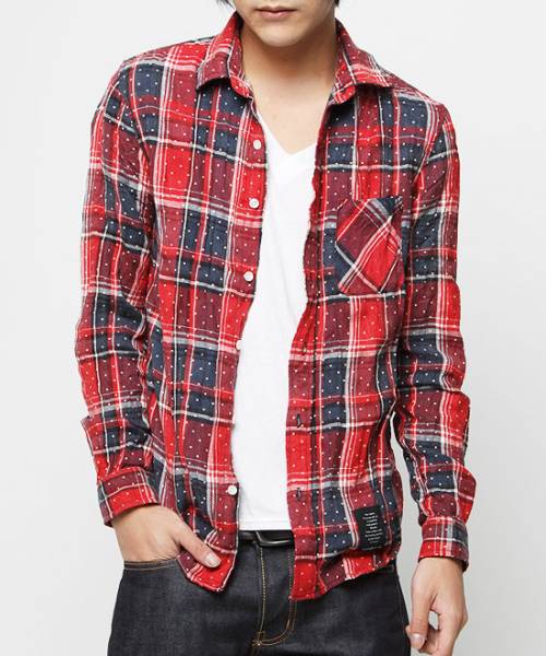 > 新品未使用VJS2101サイズS【VANQUISH クラッシュツイル チェックドット長袖シャツ】レッドカジュアルメンズ紳士ロールアップ