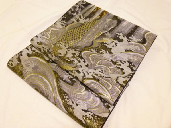 > 新品・未仕立て★京都西陣・橋本清製袋帯★黒地に登龍門柄です