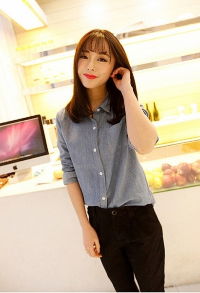 - 新品女Mデニムシャツ長袖ライトブルー肩幅38cm小さ目ボタン穴左