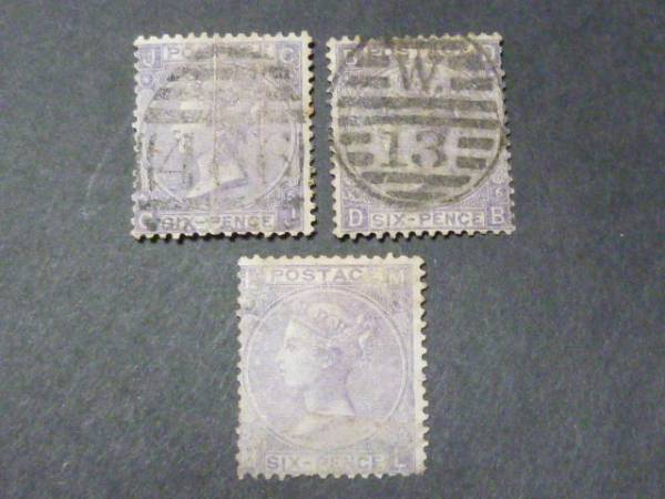 - №83 イギリス 切手 1865年 SC#45 6p 消印違 3枚 SC評価 $255
