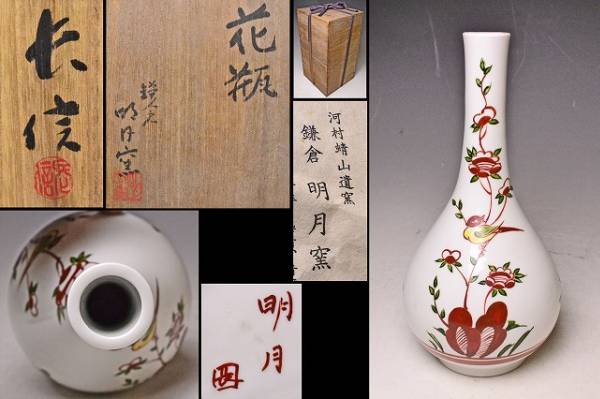 - 明月窯 ★ 河村蜻山遺窯 ★ 長信 銘か ★ 呉須赤絵花入 ★ 共箱 ★ 明月院