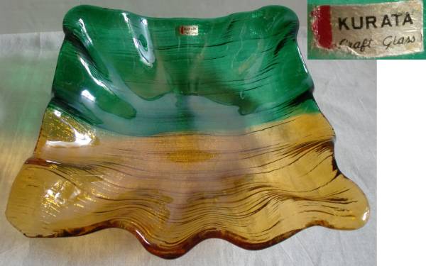 > ★レトロ KURATA Craft glass 2色 ガラス ツートンカラー 盛鉢 フレア角鉢 四角 盛皿 角皿 硝子製 工芸品 レトロ