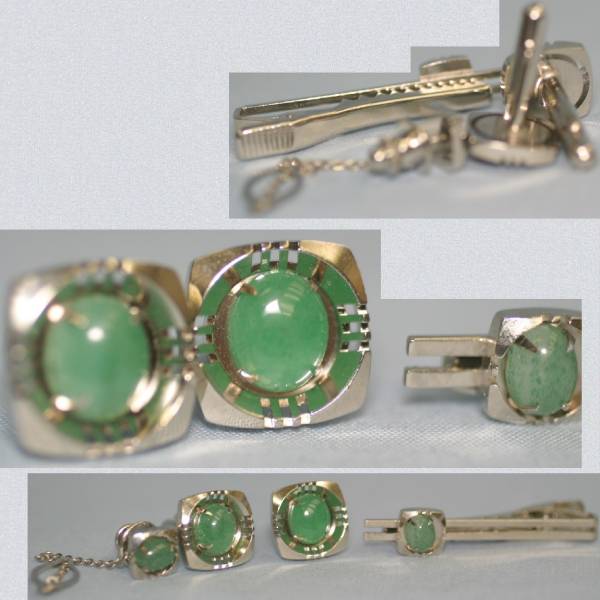 - ヒスイのような緑石付カフスネクタイピンタイタックのセット綺麗 B9-25-8