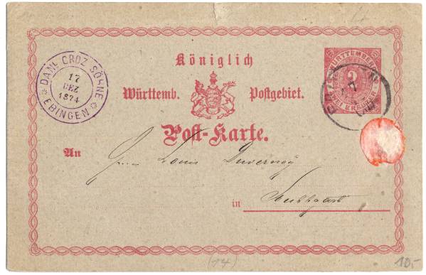 - 1874年 ドイツ ヴュルテンベルク◆実逓 葉書◆x-94
