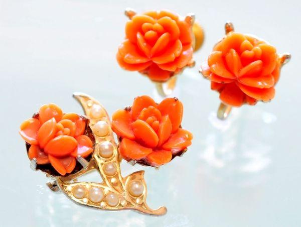 - ☆送料無料☆ コーラル ローズ バラ ジャパン ヴィンテージ 日本製 レトロ セルロイド ブローチ イヤリング コスチューム ジュエリー 2個