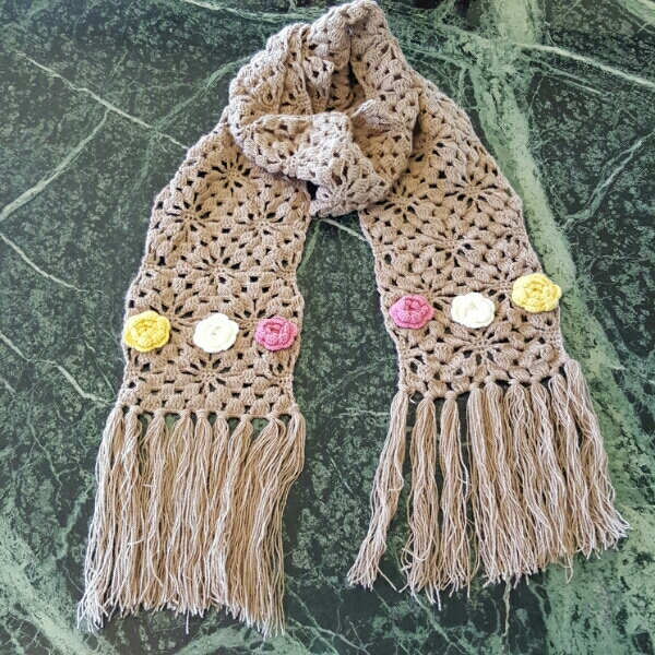 - 【美品】可愛いニットマフラー★お花モチーフ ベージュ デザインマフラー かぎ編み