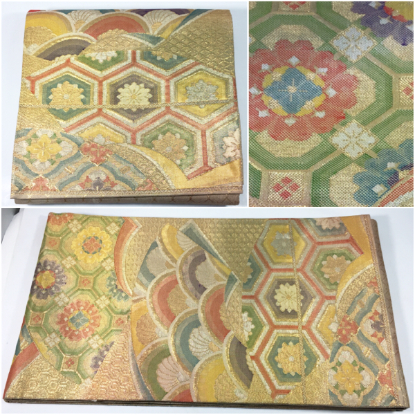 > 御仕立品 最高級 佐賀錦 古代金彩 亀甲扇紋 六通柄袋帯★116番