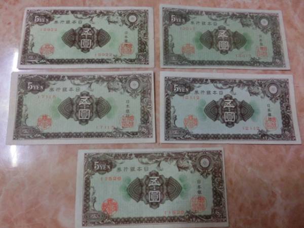 - ★ 日本銀行券A号5円 彩紋5円 全印刷工場 美品 5枚セット ★ No.220