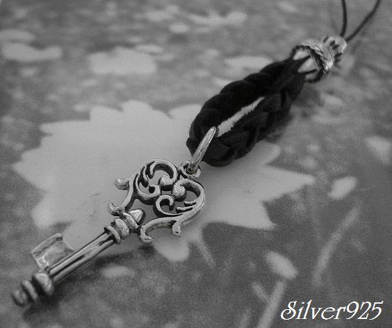 - シルバー925銀のハート キー鍵ヘッド付き牛革レザー ストラップ/黒・茶2色より