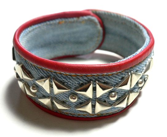 - 在庫処分★リメイク デニム 二段スタッズ ブレス/レッド/パンク.ロック風