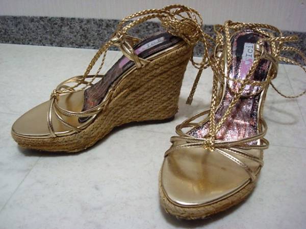 > ●●●1回使用 訳あり Ici イチ エスパドリーユ サンダルヒール 金 ゴールド 足首編み込みリボン Sサイズ 22.5cm 35.5