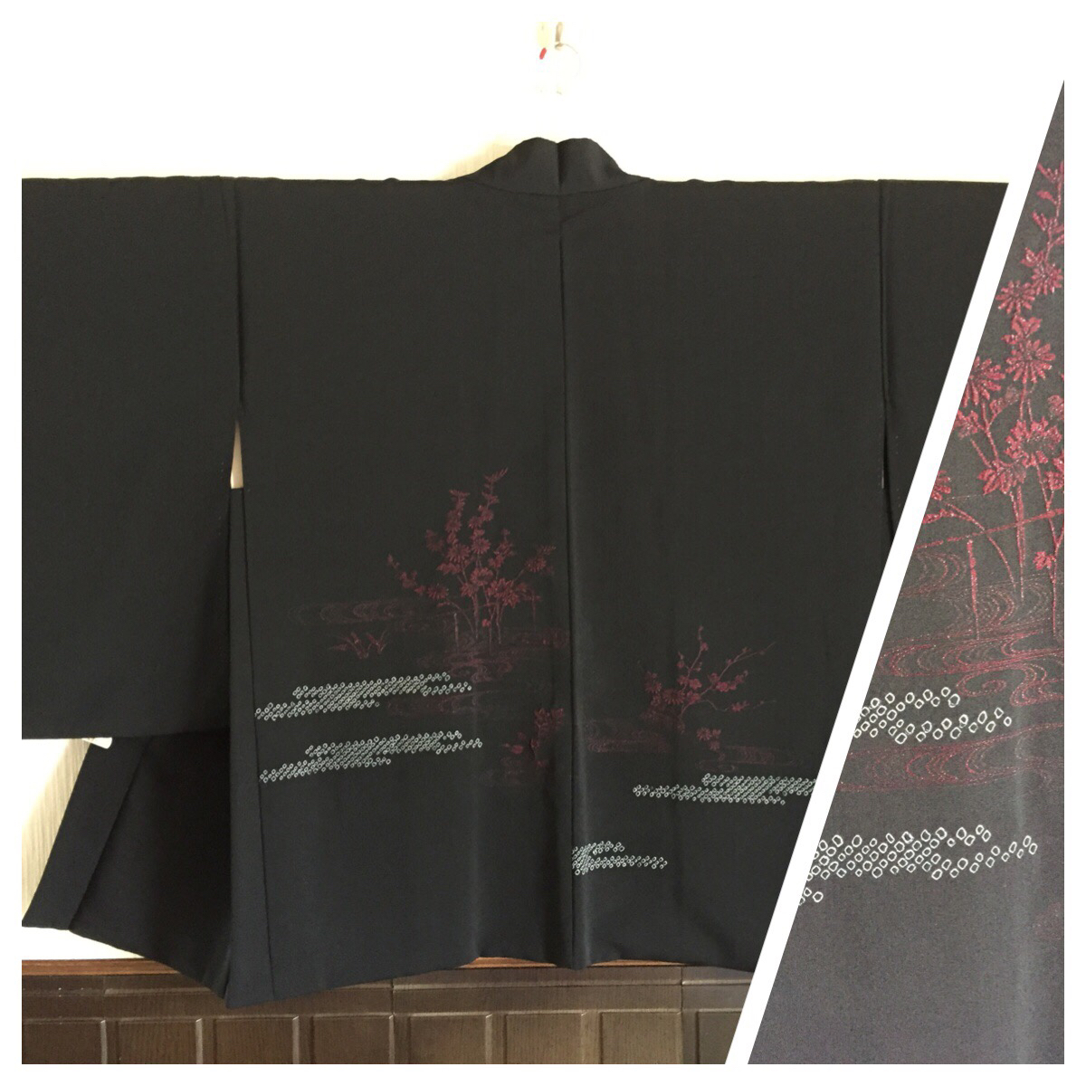 - 【黒絵羽織】正絹 袷 羽織丈74.5cm 絞り 羽織紐有り