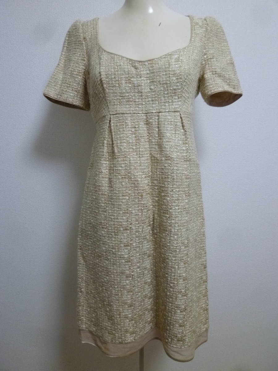 - rebecca taylor/レベッカテイラー♪淡ベージュ系ツィード裾レースワンピース2/レナウン半袖膝丈♪323