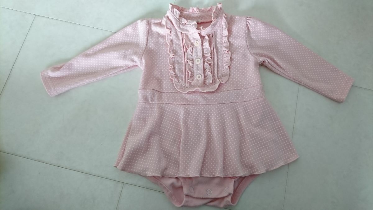 - オムツ替えしやすいボタン付ピンクドット水玉ワンピース80長袖フリル白美品ブルマ